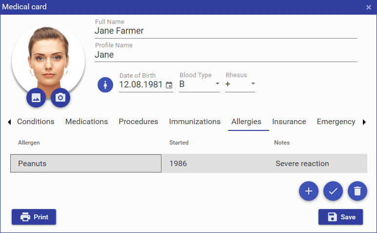 Create and maintaine personal electronic medical card on your computer. The card includes the general health information like age, blood type, conditions, allergies, immunizations, insurance policies, etc. You can quickly print a health profile for your doctor or a wallet-sized Emergency card.