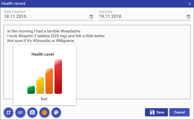 In GooPatient you can make health records in the most natural way. Using #hashtags like in Twitter you can easily organise records and link them to conditions, doctors, treatments, etc. Quickly add any health-related notes to your health journal: symptoms, medications, lab tests.
