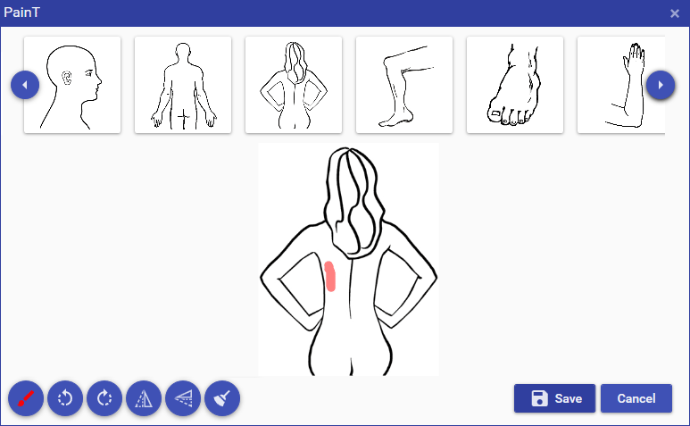 When you need to describe where it pains, one picture is worth ten thousand words. The PainT tool in GooPatient allows you easily create such picture and attach it to Health record. Just select the needed part of the body and draw with marker where it pains. You can also draw on your own photos.