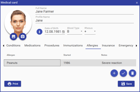Create and maintaine personal electronic medical card on your computer. The card includes the general health information like age, blood type, conditions, allergies, immunizations, insurance policies, etc. You can quickly print a health profile for your doctor or a wallet-sized Emergency card.